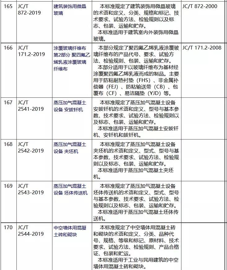 其中,涉及多項墻體材料產品、設備標準,包括《蒸養泡沫混凝土制品用摻合料》(JC/T 2554-2019)、《蒸壓加氣廣西混凝土設備安拔釬機》(JC/T 2541-2019)、《蒸壓加氣混凝土設備 夾坯機》(JC/T 2542-2019)、《蒸壓加氣混凝土設備坯體傳送機》(JC/T 2543-2019)、《中空墻體用混凝土磚和砌塊》(JC/T 2544-2019)、《泡沫混凝土自保溫砌塊》(JC/T 2550-2019)、《絕熱材料中可溶出氯化物、氟化物、硅酸鹽和鈉離子的化學分析方法》(JC/T 618-2019)等。